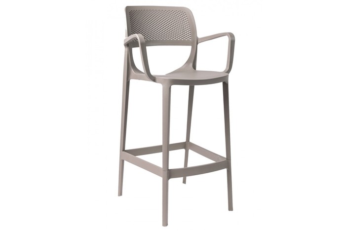 Taburete de diseño, con respaldo y brazos, polipropileno inyectado reforzado con fibra de vidrio, color capuchino. Tratamiento anti rayos UV. Uso en exterior e interior. Sillón a juego. Otros colores disponibles.