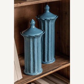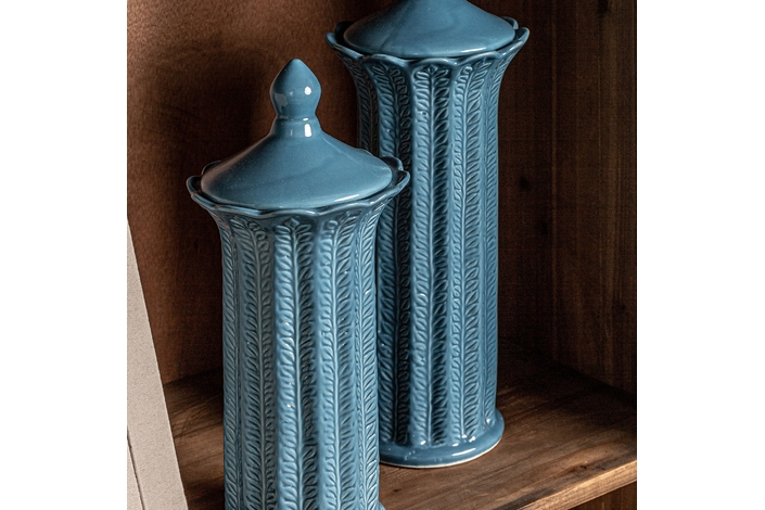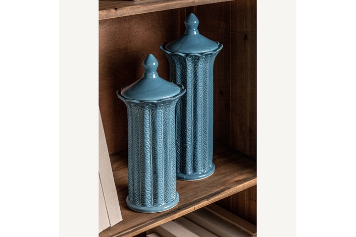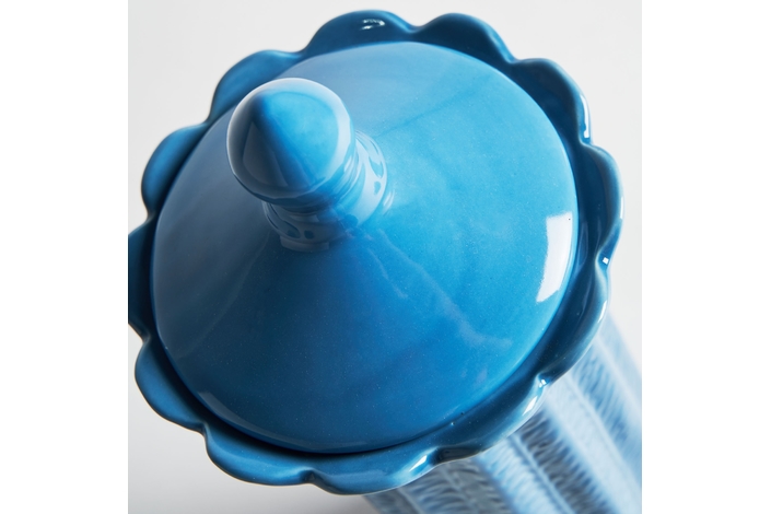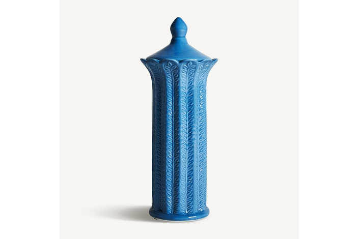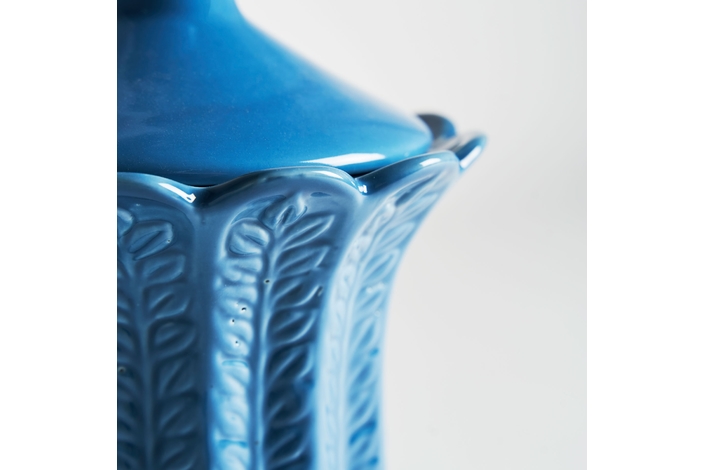 Tibor zaea, en color azul, de estilo contemporáneo. Fabricado en cerámica.