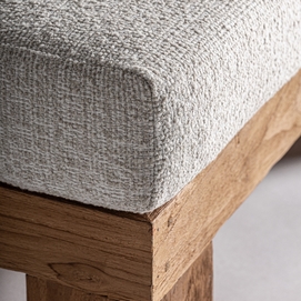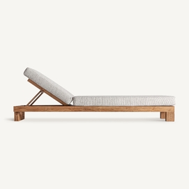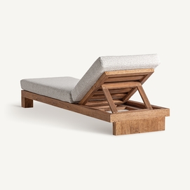 Tumbona testa, en color marrón, de estilo colonial. Fabricado en madera de teka, combinado con polipropileno reciclado y espuma. Producto desmontable, elevable, desenfundable.