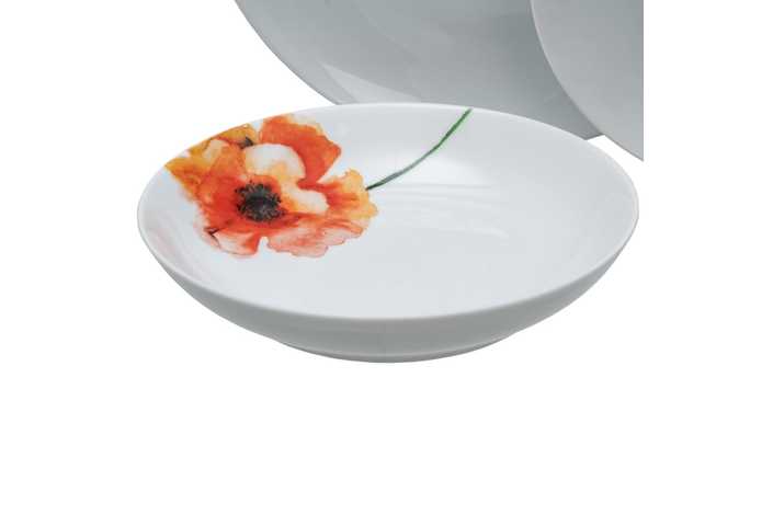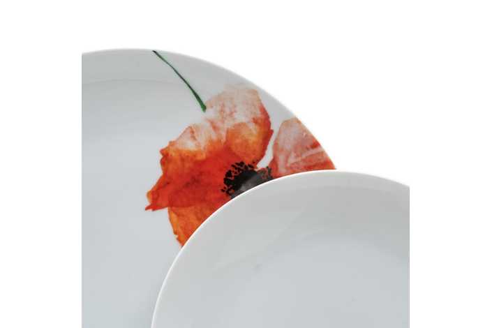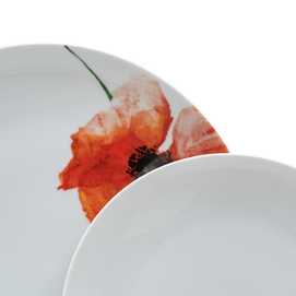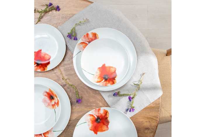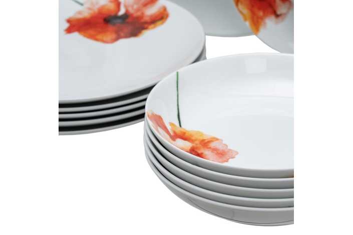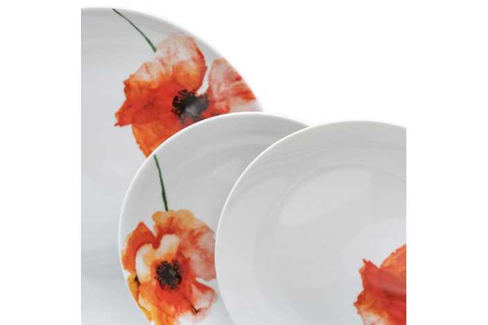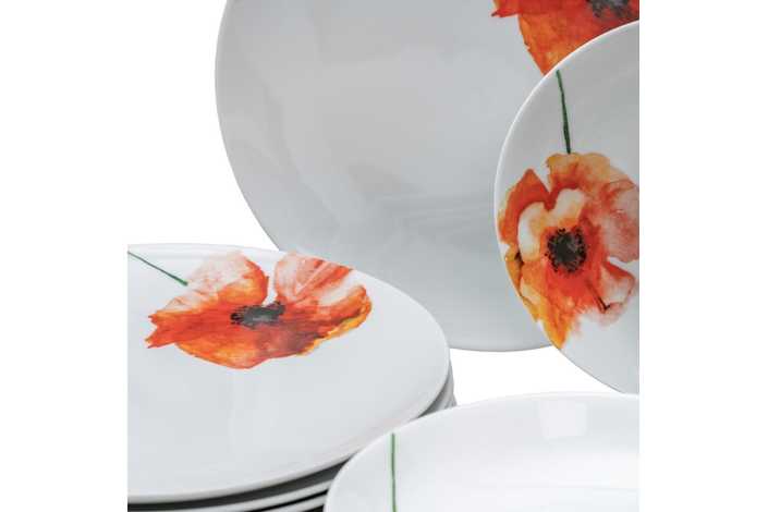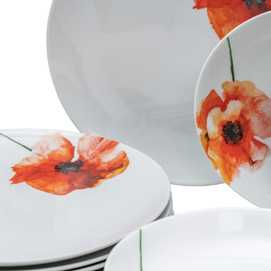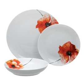 Material: porcelana. 6 platos llanos, diám 27x2,5cm. 6 platos hondos, diám 20,5x4cm. 6 platos de postre, diám 20,5x2cm. Apto para lavavajillas y microondas. No apto para canal HORECA.