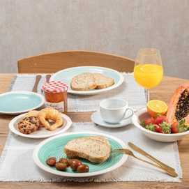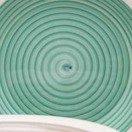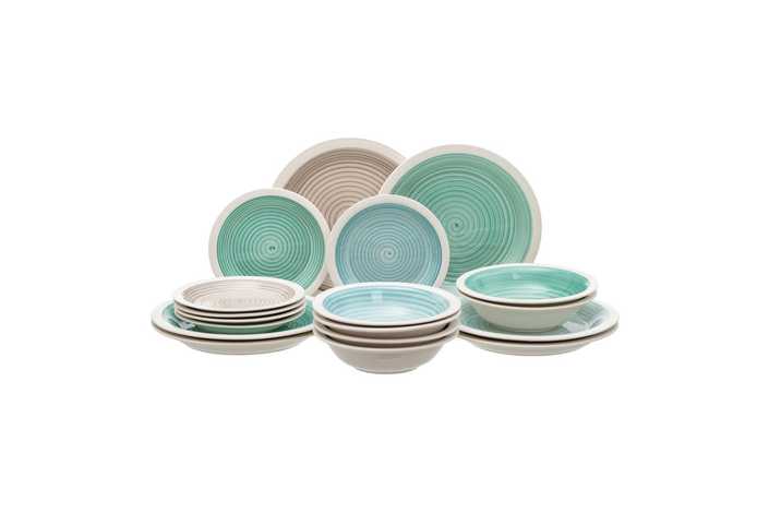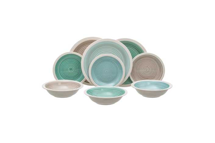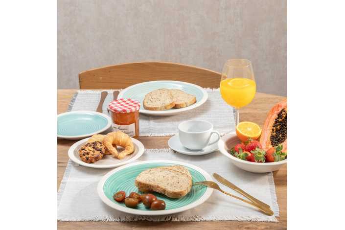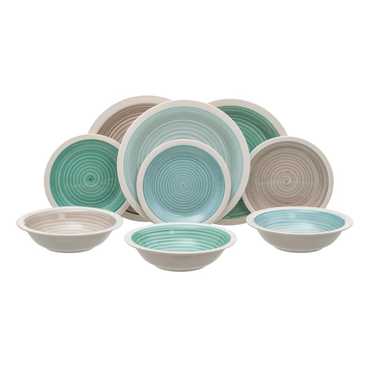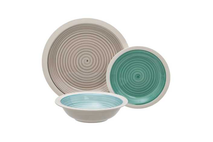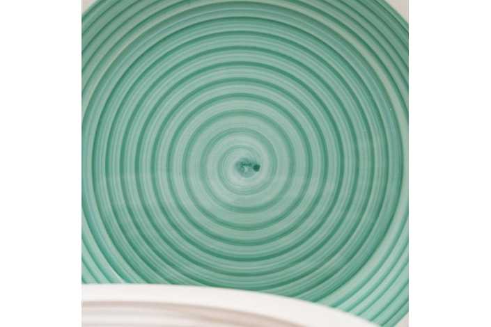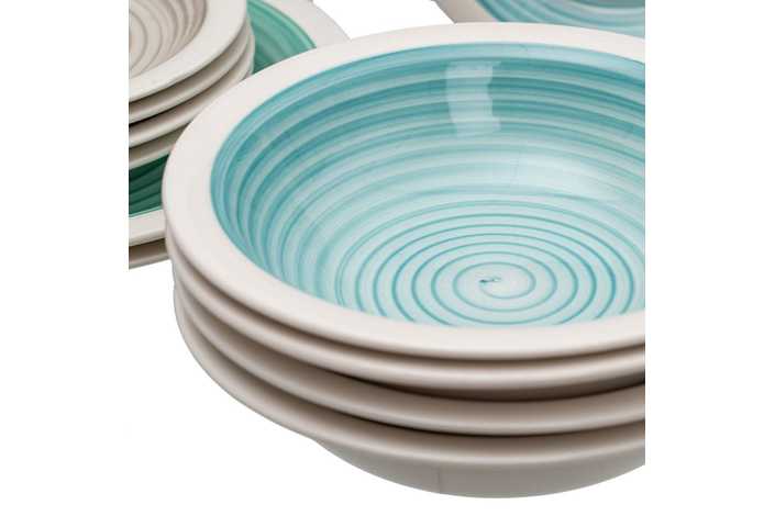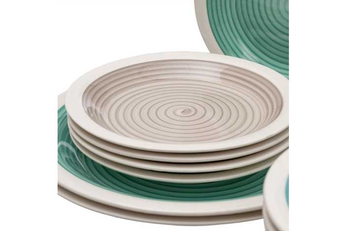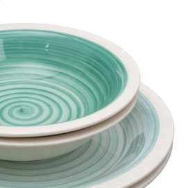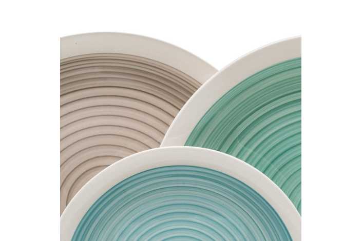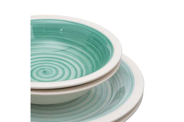 Material: stoneware. 6 platos llanos, diám 27x3cm. 6 platos hondos, diám 21x5,5cm. . 6 platos de postre, diám 19,5x2,5cm. Pintado a mano. Apto para lavavajillas y microondas. No apto para canal HORECA.