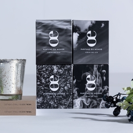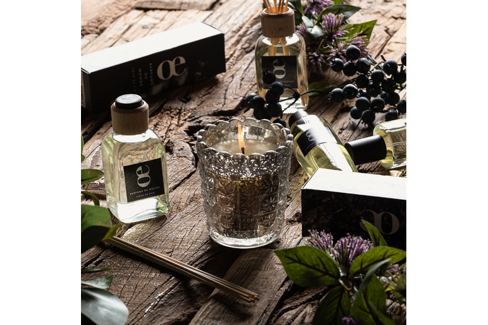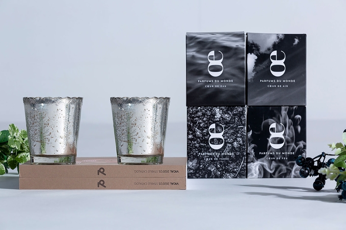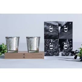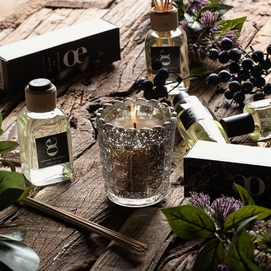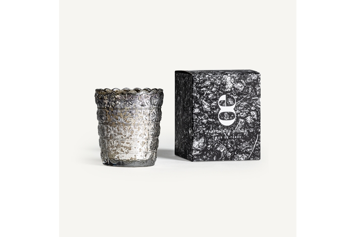 VELA DE CERA Y VIDRIO, ENGLOBADO EN LA FAMILIA DE PORTAVELAS / VELAS / AROMAS, COLOR PLATA VIEJO, DE ESTILO CLÁSICO, MEDIDAS: 8 LARGO x 8 ANCHO x 9 ALTO