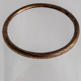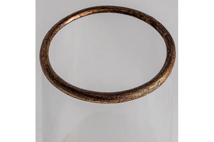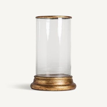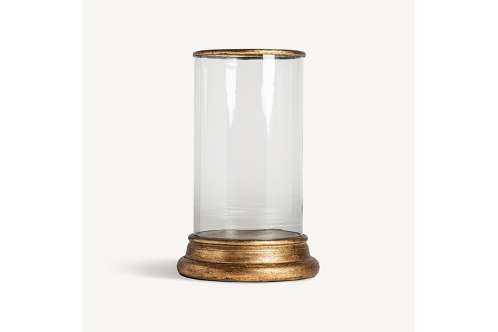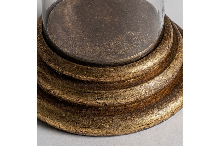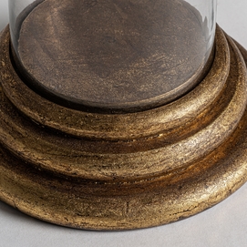 Portavela, en color oro viejo, de estilo art deco. Fabricado en madera de mango, combinado con hierro y cristal.