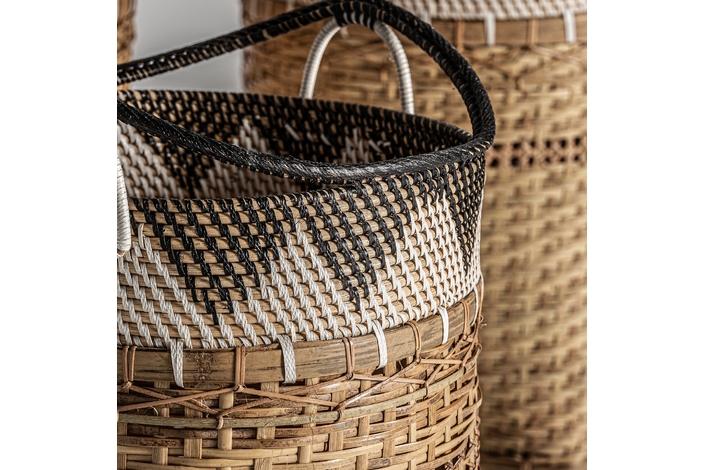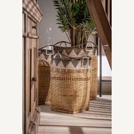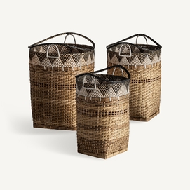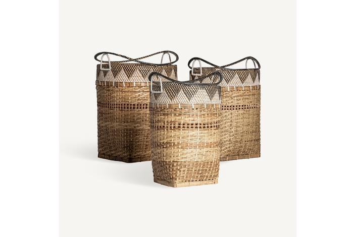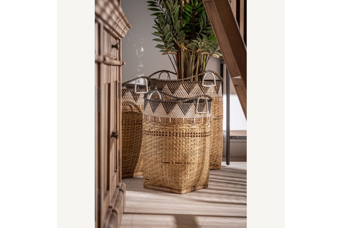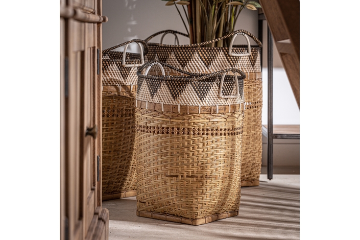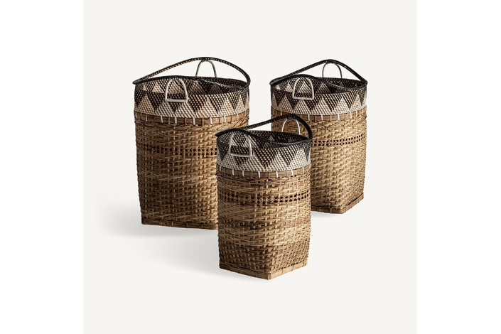 Cesto j/3 zirba, en color marrón, de estilo étnico. Fabricado en ratán. Producto apilable.