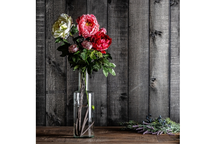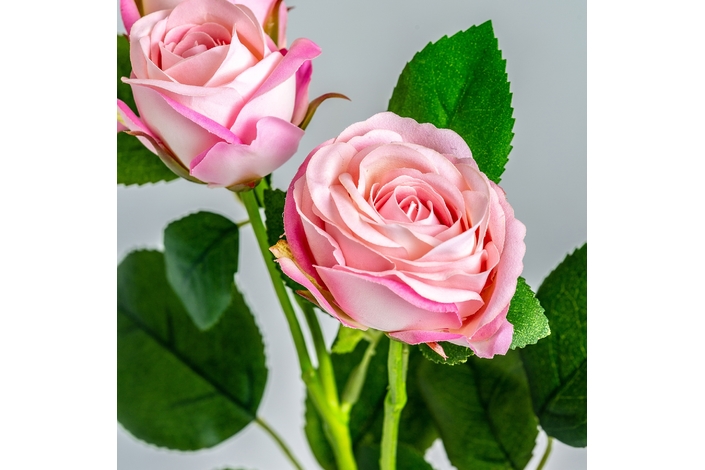 Planta rosal, en color rosa, de estilo clásico. Fabricado en plástico, combinado con poliéster.