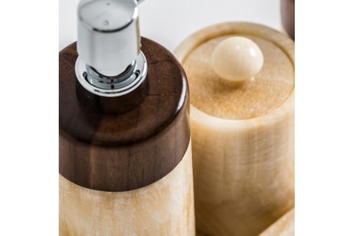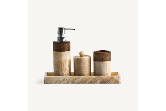 Una colección que te cautivará por la belleza del material de la piedra ónix y madera de ébano. Se trata de un juego de 4 piezas que se compone de: 3 accesorios y una bandeja que los recoge.