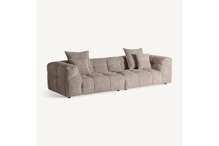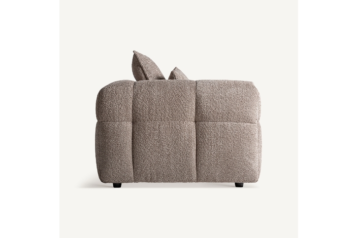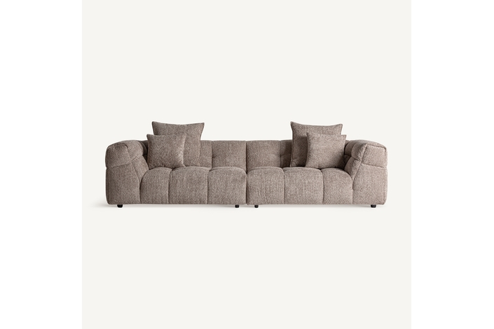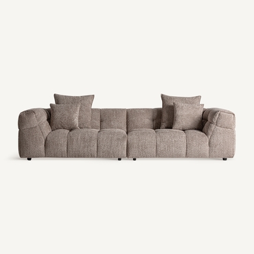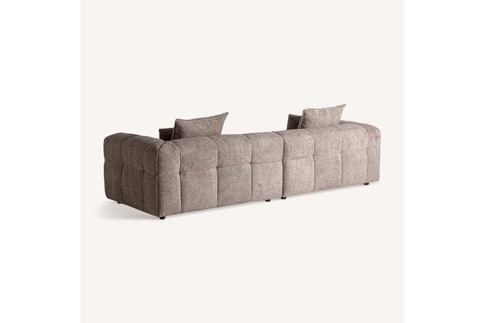 Sofá barlin, de estilo contemporáneo. Fabricado en madera de alerce, en color marrón, combinado con poliéster, en color marrón y espuma. Patas de hierro en color negro. Cojines rellenos de pluma de oca mixta. .